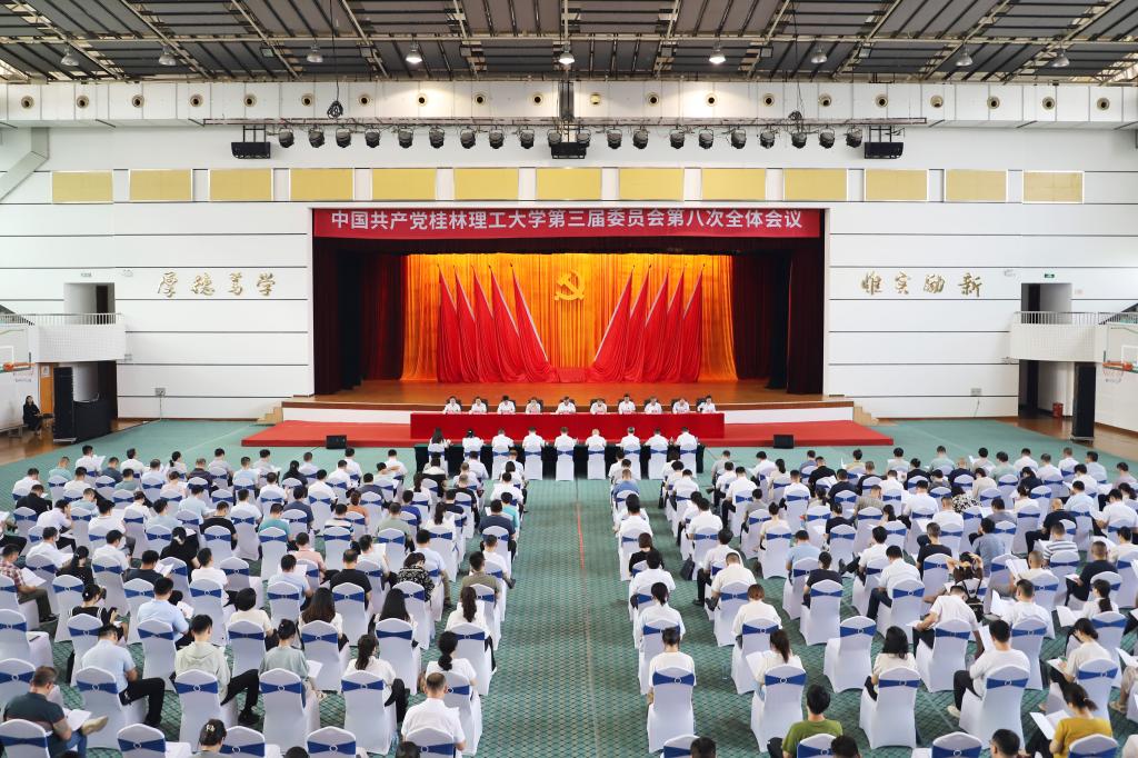 7月12日,中国共产党beat365手机版官网入口第三届委员会第八次全体会议在学校屏风校区体育馆召开。全会以习近平新时代中国特色社会主义思想为指导,深入学习贯彻习近平总书记关于教育的重要论述,认真贯彻落实习近平总书记关于广西工作论述的重要要求,总结学校党委三届七次全会以来的主要工作,部署下一阶段重点工作任务,动员全校教职员工锚定目标、攻坚克难、解放思想、担当实干,奋力推动高水平理工大学建设实现新突破。