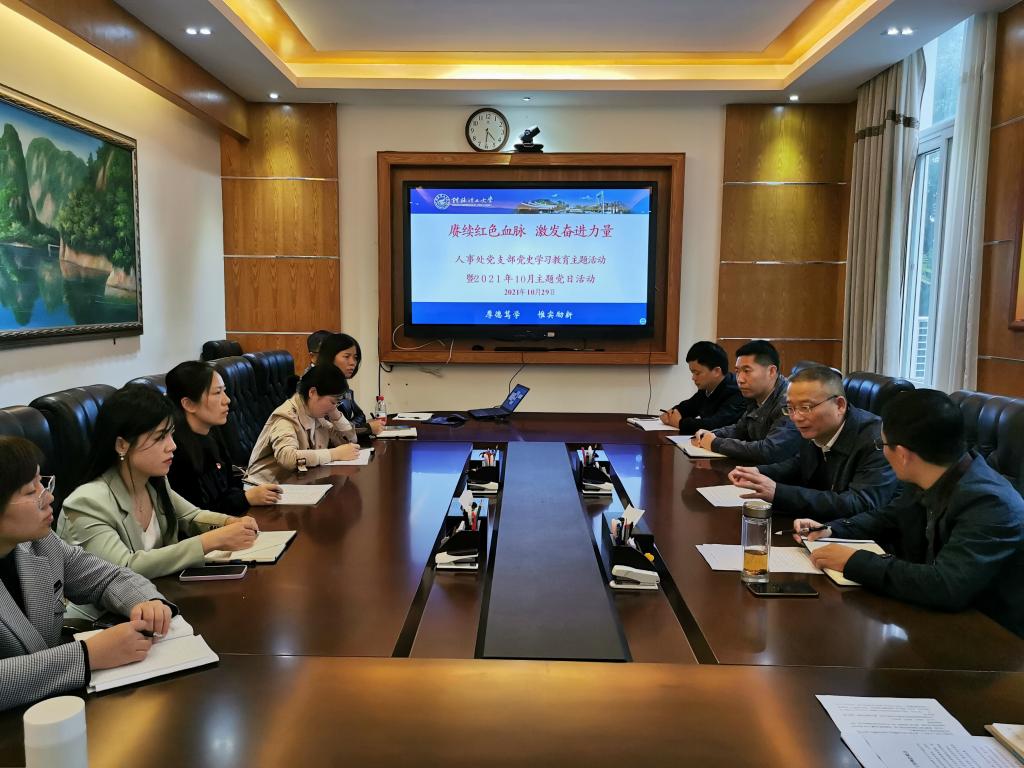 10月29日,人事处党支部以“赓续红色血脉 激发奋进力量”为主题开展主题党日活动,持续推进党史学习教育。学校党委常委、副校长王敦球同志以普通党员身份参加活动。党支部书记、校长助理、人事处处长辛立章同志主持活动。