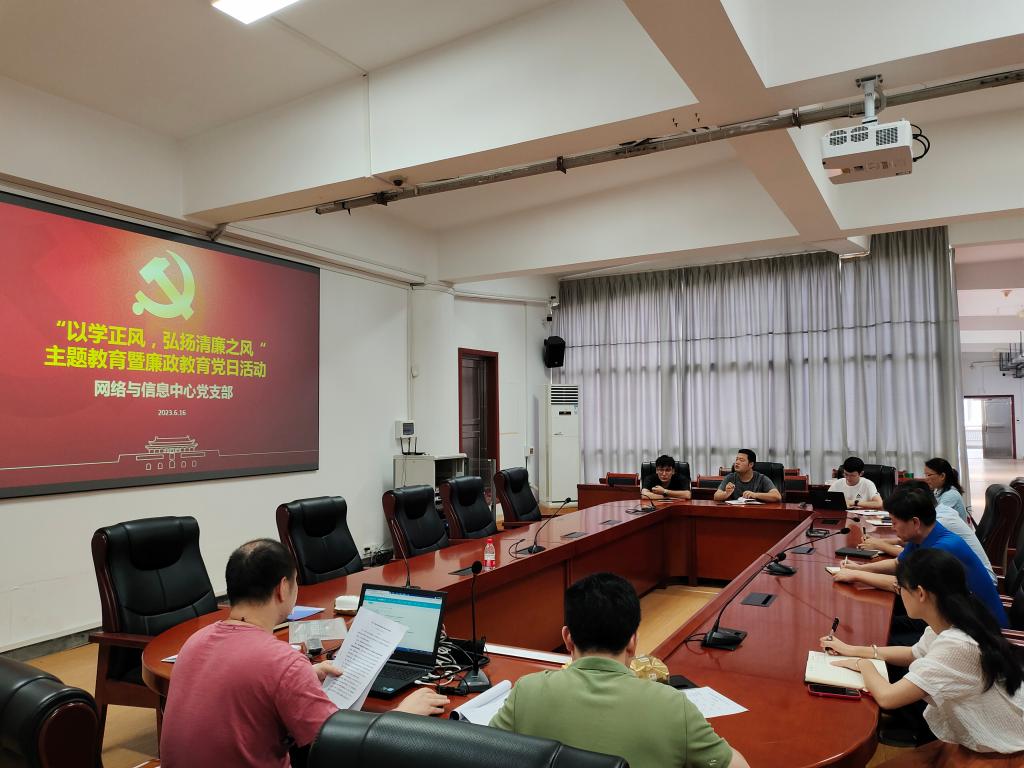 加强党风廉政教育,强化廉洁风险防范意识,作为中心“四梁八柱”党建+业务深度融合工作的开展的重要内容,根据廉政周工作的部署安排,网络与信息中心党支部开展了“以正学风、弘扬清廉之风”廉政主题党日活动。活动由杨祥书记主持,全体党员、预备党员参加。